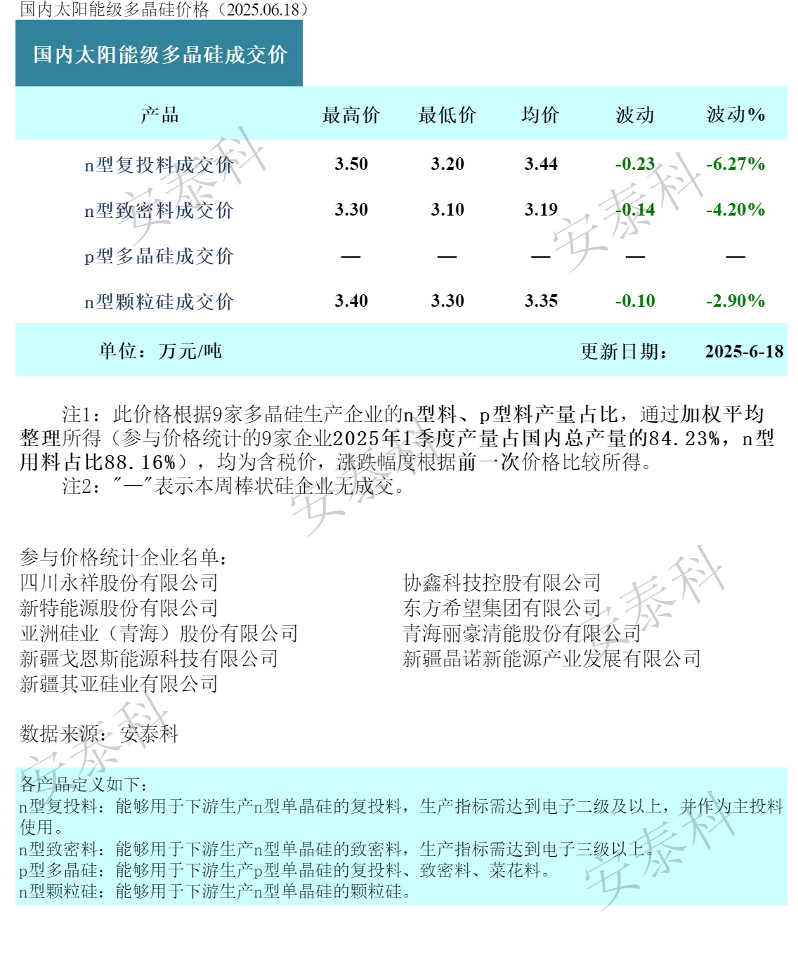 智通财经APP获悉,硅业分会发文称,本周多晶硅价格出现下降。n型复投料成交价格区间为3.20-3.50万元/吨,成交均价3.44万元/吨,环比下降6.27%。n型颗粒硅成交价格区间为3.30-3.40万元/吨,成交均价为3.35万元/吨,环比下降2.90%。p型多晶硅暂无批量成交。