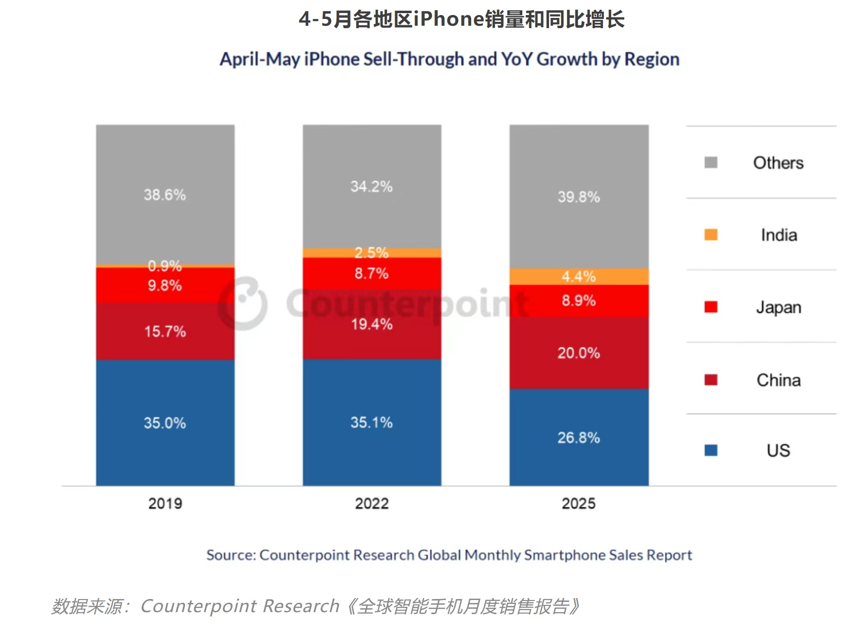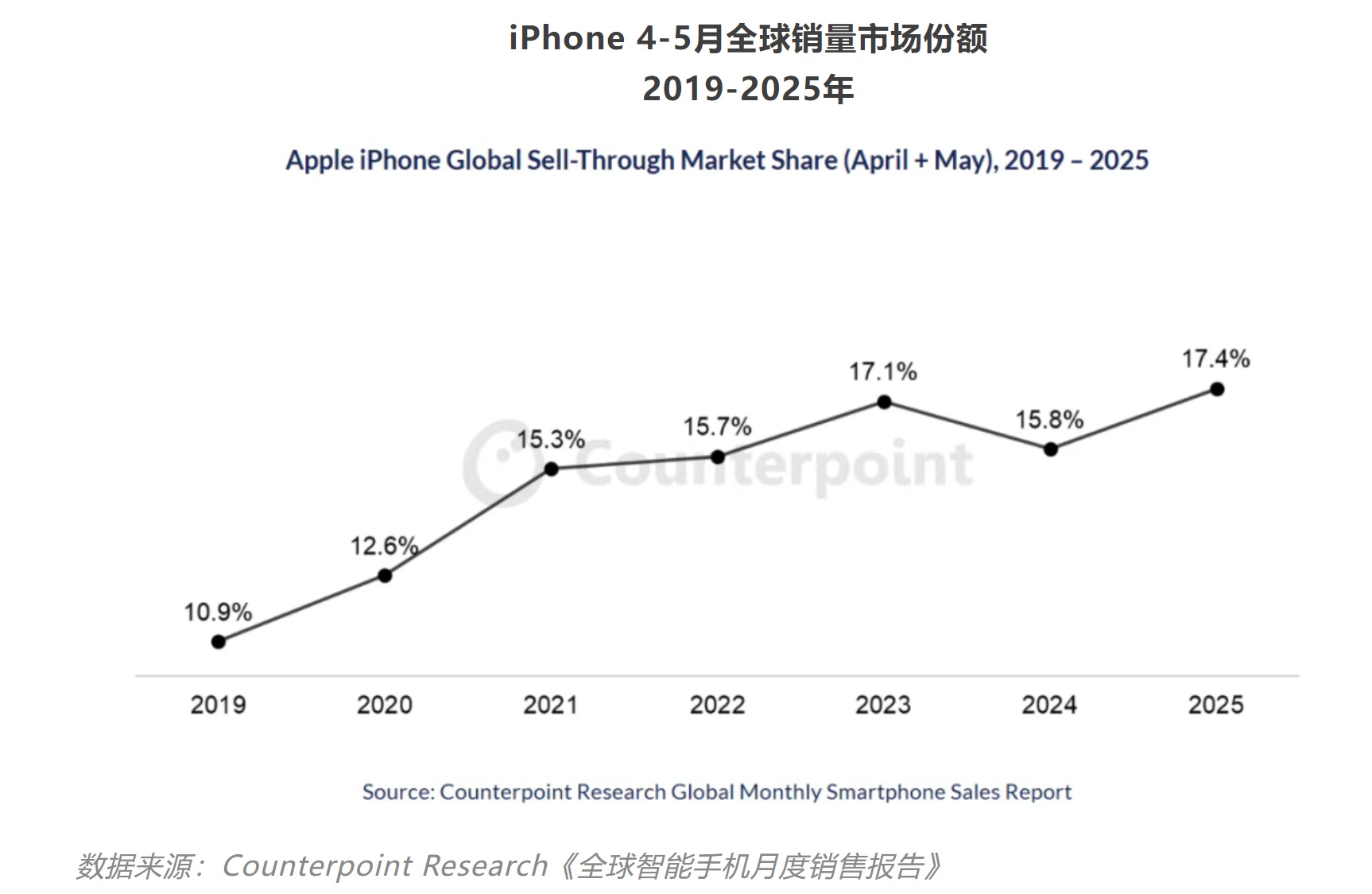 Research最新《全球智能手机月度销售报告》的初步数据,iPhone在2025年4-5月的全球销量同比增长15%,也创下后疫情时代以来该时期市场占有率的最高纪录。美国与中国作为Apple的两大关键市场,是该时期最主要的市场增长动力,终结过去三年在此销售淡季的下滑趋势,首次实现同比正增长。
