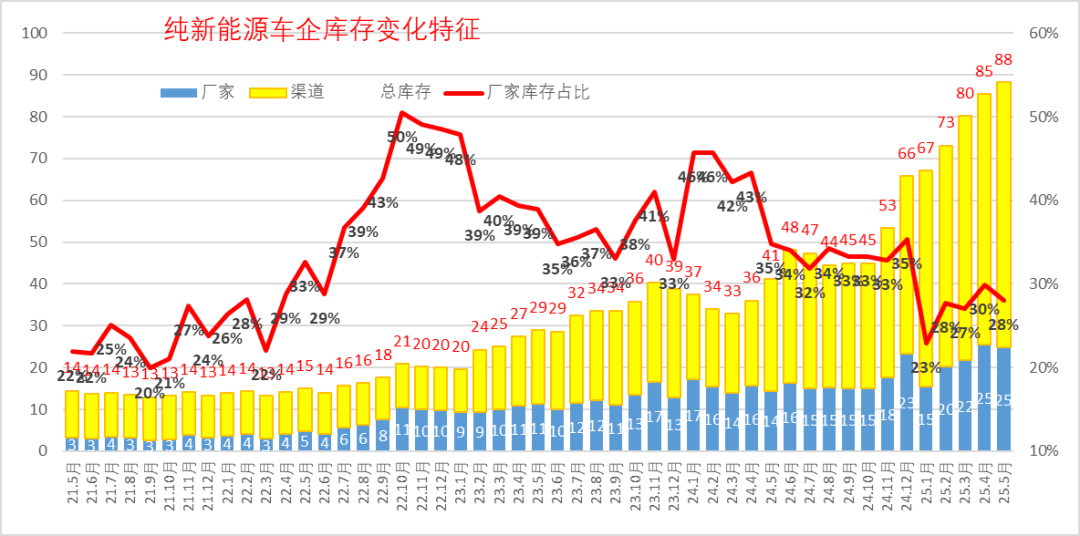 从仅生产新能源车的企业的库存变化特征分析看,2023年年初库存20万辆,年初的库存保持较好,随后进入库存快速增长期,2023年12月末的纯新能源车企总体新能源库存降到39万辆,2024年3月进一步降到33万辆, 2024年12月上升到66万辆,2025年5月库存88万辆,其中新能源经销商的厂家和渠道库存明显上升,行业库存总体压力逐步加大。