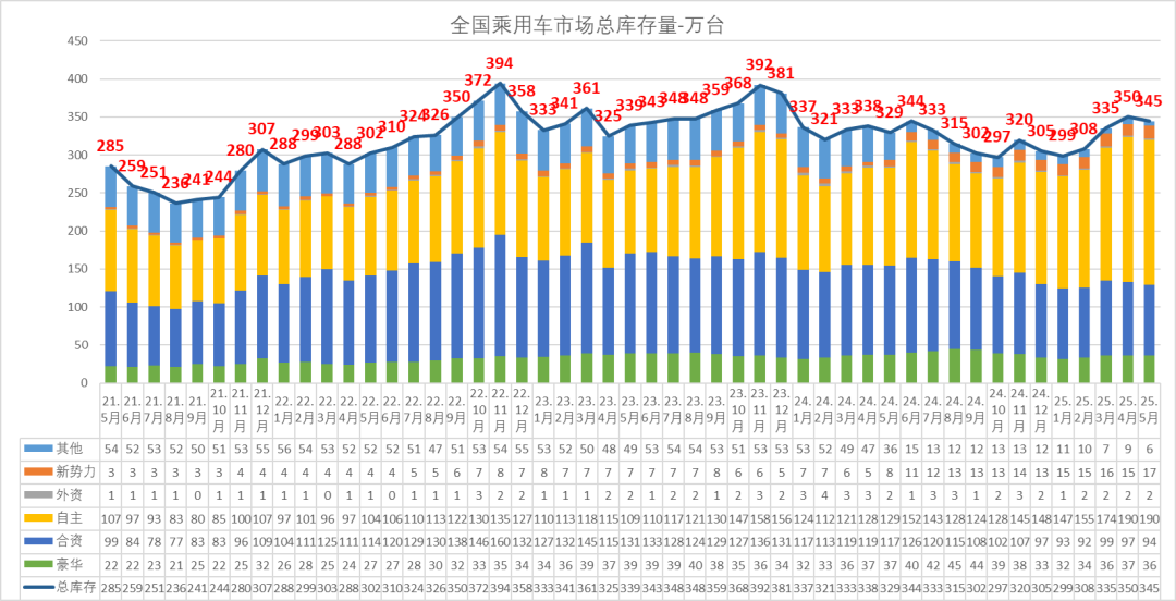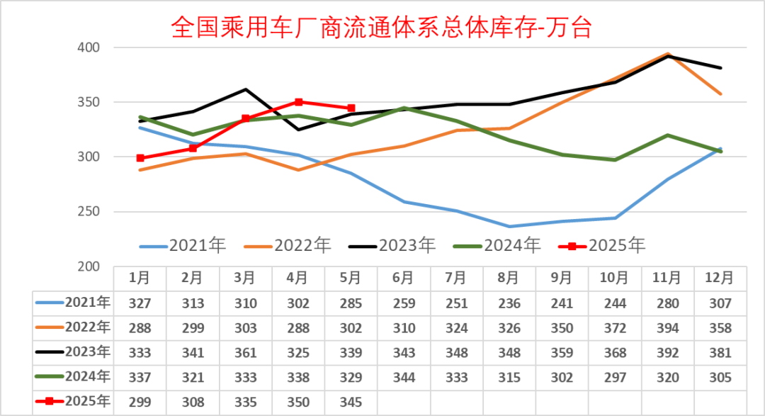 智通财经APP获悉,乘联分会秘书长崔东树发文称,2025年5月月末全国乘用车行业库存345万辆,较上月下降5万辆,较2024年5月增16万辆,形成库存持续高位的特征。目前的政策启动带来厂商的总体乐观,以旧换新的生产较高,厂家批发相对积极,行业库存创出近两年新高。随着中央促消费政策的推动,各地车展等营销活动的活跃,随着6-8月的销售逐步转入季节性淡季,未来三个月的销量逐步下行。因此根据2025年5月底的库存与未来销量综合预估的现有库存支撑未来销售天数在54天,相对于2023年5月的54天、2024年5月的51天,今年5月的总体库存压力稍有增大。