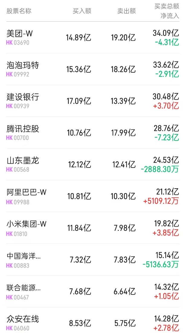 北水净买入最多的个股是小米集团-W(01810)、建设银行(00939)、众安在线(06066)。北水净卖出最多的个股是腾讯(00700)、阿里巴巴-W(09988)、石药集团(01093)。