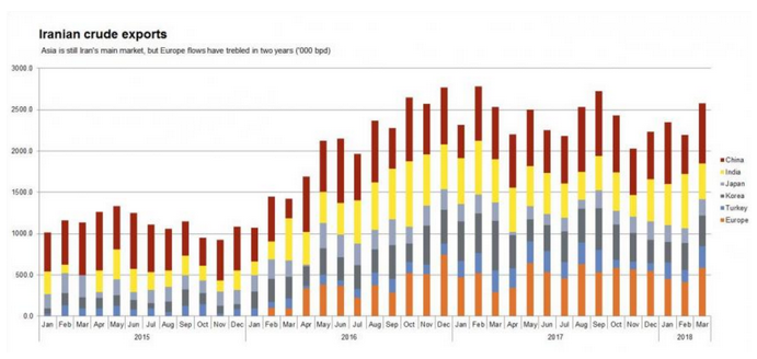 包括法国的道达尔(Total)公司,意大利的Eni和Saras公司,西班牙的Repsol与Cepsa公司,以及希腊的海伦石油公司在内的欧洲主要炼油商正准备在美国制裁开始实施之前,停止向伊朗购油。