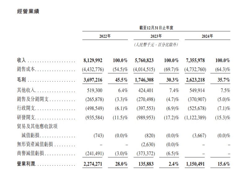 财务方面,于2022年、2023年及2024年,公司分别录得收入人民币81.3亿元、人民币57.61亿元及人民币73.56亿元。同期,公司分别录得调整后净利润(非国际财务报告准则计量)人民币22.56亿元、人民币2.58亿元及人民币12.6亿元,调整后净利润率(非国际财务报告准则计量)分别为27.7%、4.5%及17.1%。