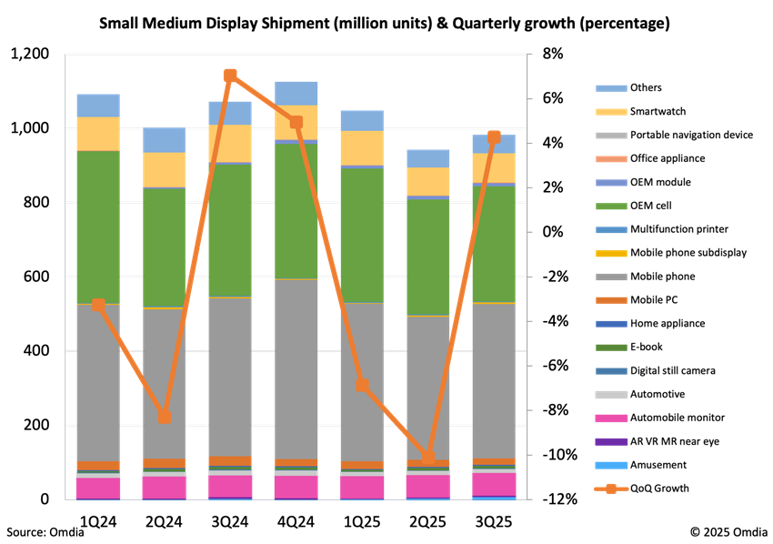 不过,由于持续的库存调整,2025年第二季度中小尺寸显示面板出货量预计将下降至9.42亿片。其中AMOLED面板出货量将达5.51亿片,市场份额保持在58%。在各应用类别中,手机显示屏(包括OEM手机屏和智能手表屏)将出现最显著下滑,环比降幅分别达14%和18%。与之形成鲜明对比的是,受益于新款移动游戏机的发布,娱乐设备显示屏出货量将实现环比超100%的大幅增长。