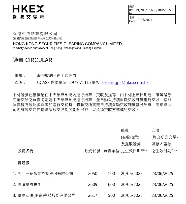 智通财经APP获悉,6月19日,香港中央结算有限公司发布通告称,三花智控(02050)、佰泽医疗(02609)、药捷安康-B(02617)已获接纳在中央结算系统内进行结算、交收及提存。自2025年6月20日起,该等证券在联交所的买卖将透过中央结算系统进行结算;并于2025年6月23日起透过中央结算系统自动以持续净额交收制度进行交收。