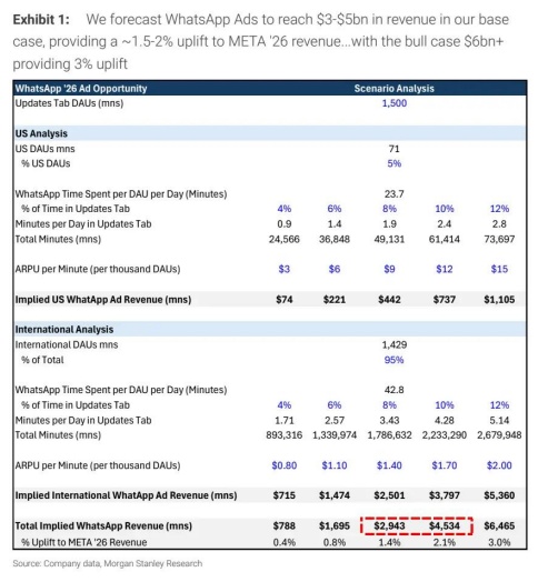 大摩在报告中指出,尽管WhatsApp用户规模庞大,但约95%的用户位于美国以外地区(广告变现率较低),且用户在“动态”标签页的停留时间较短(大部分时间用于通话和消息)。然而,凭借Meta强大的数据支持和广告工具,WhatsApp广告业务仍具备可观的增长潜力。