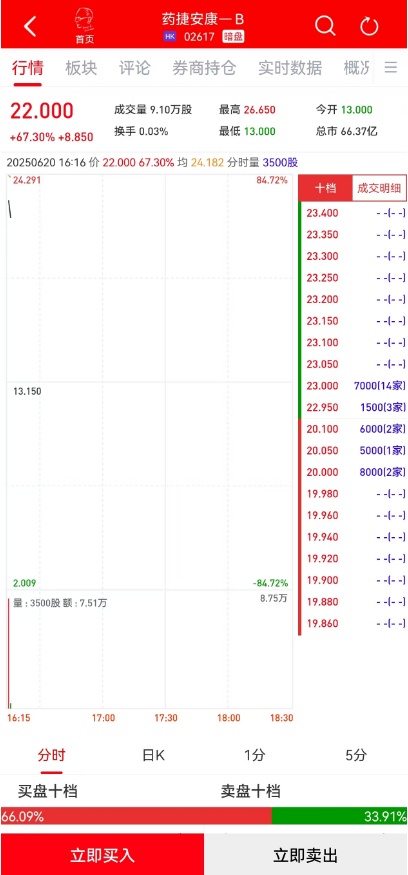 智通财经APP获悉,药捷安康-B(02617)将于6月23日(周一)在香港挂牌。截至发稿,利弗莫尔证券暗盘交易显示报价22港元,较招股价13.15港元上涨67.3%,每手500股,不计手续费,每手赚4425港元。