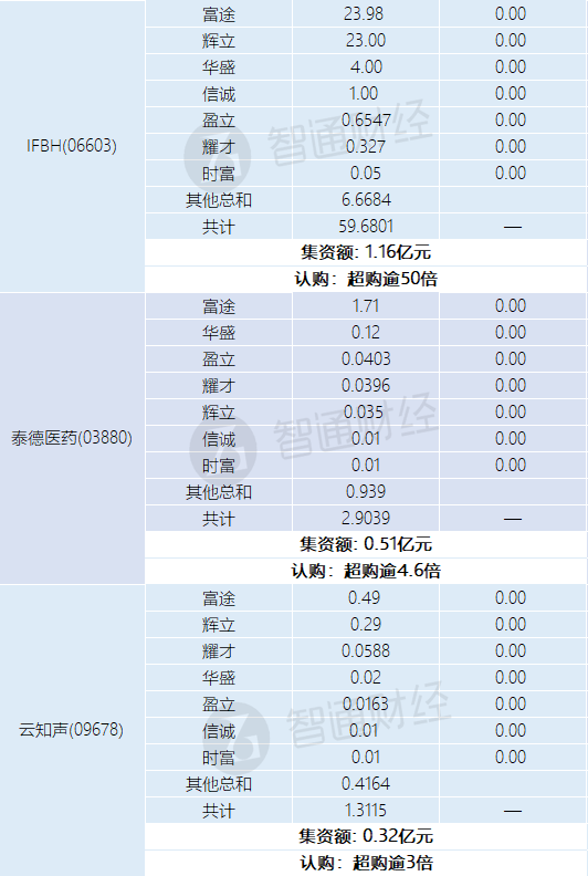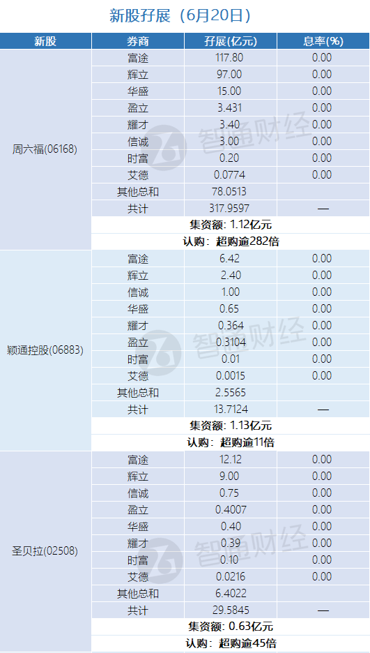 智通财经APP获悉,周六福(06168)、颖通控股(06883)、圣贝拉(02508)、IFBH(06603)、泰德医药(03880)、云知声(09678)正在招股中。截止6月20日,富途、辉立、耀才等券商合计为周六福借出317.9597亿港元,超购逾282倍;合计为颖通控股借出13.7124亿港元,超购逾11倍;合计为圣贝拉借出29.5845亿港元,超购逾45倍;合计为IFBH借出59.6801亿港元,超购逾50倍;合计为泰德医药借出2.9039亿港元,超购逾4.6倍;合计为云知声借出1.3115亿港元,超购逾3倍。