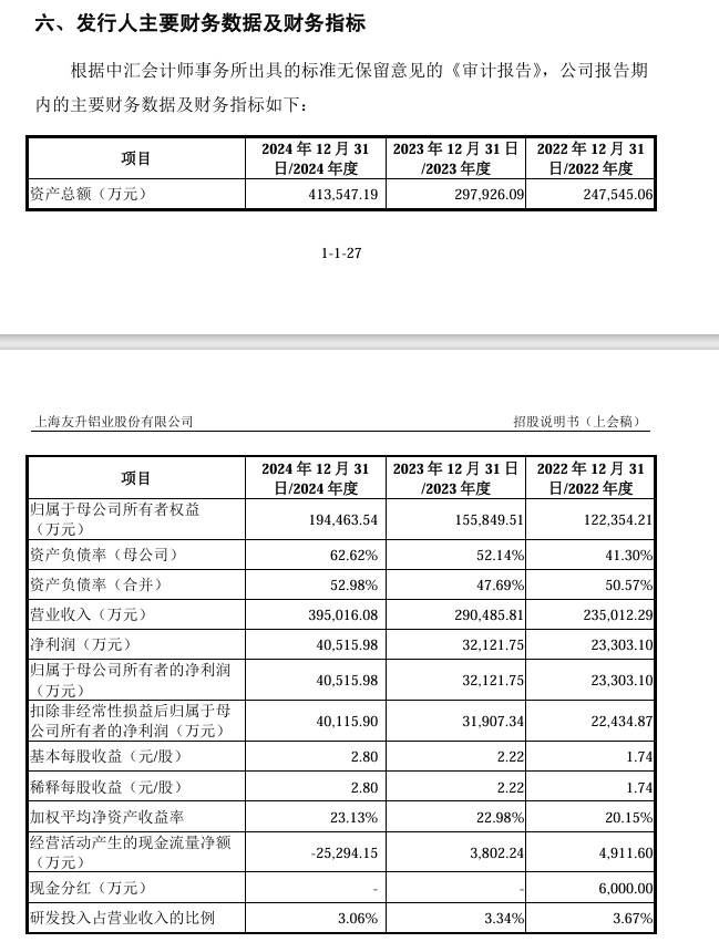 财务方面,于2022年度、2023年度及2024年度,友升股份实现营业收入约为23.5亿元、29.05亿元、39.5亿元人民币;同期,公司实现净利润分别为约2.33亿元、3.21亿元、4.05亿元人民币。