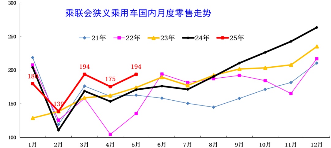 2025年5月全国乘用车市场零售194万辆,同比增长13.3%,环比增长10.1%;今年累计零售882万辆,同比增长9.1%。前几年国内车市零售呈现“前低后高”的走势,今年5月零售较2018年5月181万的最高水平增长6%,呈现超强增长态势。