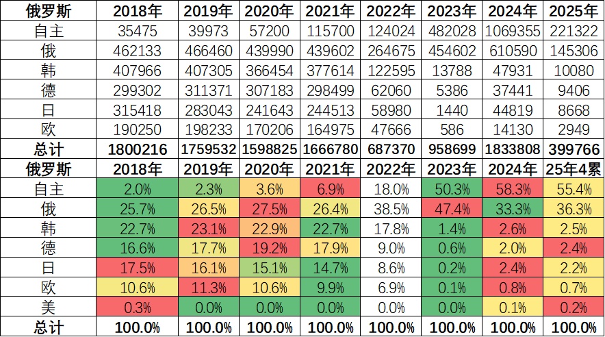 俄乌冲突后,因制裁和物料短缺,国际车企相继退出俄市场。中国车企在2021年初在俄罗斯市场已经逐步崛起的状态,但份额在7%左右;2023年中国车企抓住了俄罗斯国内市场需求相对旺盛,而供给不足的特征,实现了突破50%的份额;2024年自主品牌在俄罗斯6-9月的月度份额又突破了60%的份额,实现了中国车企强势增长的表现。但2024年4季度的自主份额持续下行,2025年1-4月微降到55.4%。