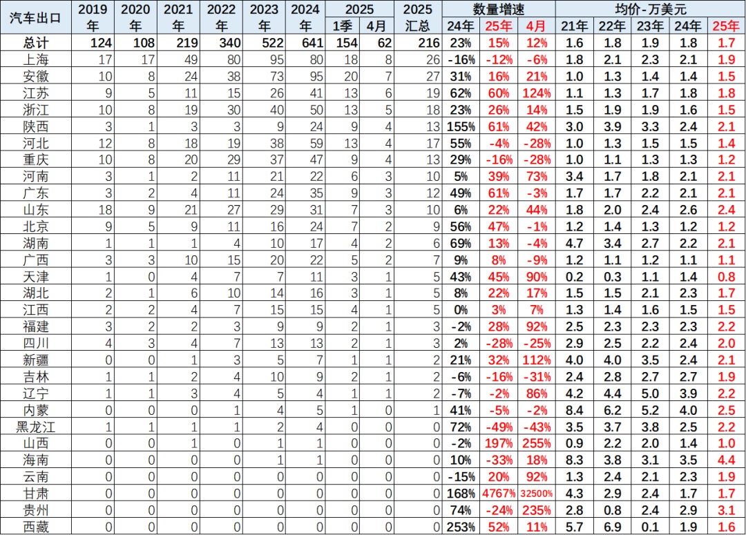 2024年上海出口的全国汽车龙头地位被安徽替代,但2025年安徽仍保持出口第一的地位。上海对中国出口的重要意义极其明显。2025年上海汽车出口26万辆,这里主要是由于上海本地的企业相对比较优秀,尤其是上汽乘用车和特斯拉两家企业,4月出口量都相对较强。