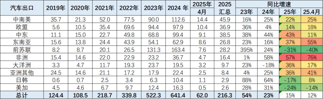 中国汽车出口总体表现较强,其中针对中东和非洲以及大洋洲的出口表现相对优秀。而针对前苏联地区、美加、日韩出口表现压力较大。