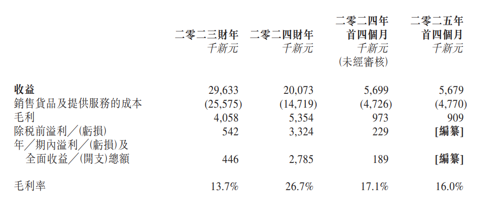 财务方面,2023财年、2024财年以及2025年首四个月,长乐控股实现收益分别约为2963.3万新元、2007.3万新元以及567.9万新元,毛利分别约为405.8万新元、535.4万新元以及90.9万新元,毛利率分别约为13.7%、26.7%、16%。
