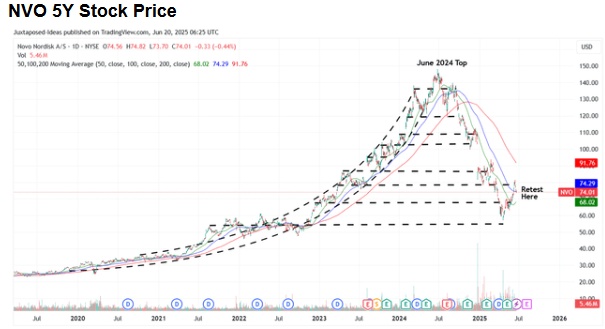 目前,多头已经成功在 2025 年 4 月市场最糟糕的时候支撑住了诺和诺德股票的底部,价格在 58 美元处企稳。此后,该股票迅速回升,尽管未能突破之前的 81 美元阻力位,而且在过去一周似乎势头出现了逆转。