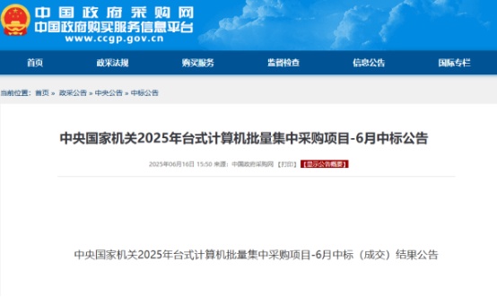 近日,中央国家机关政府采购中心发布了2025年台式计算机批量集中采购项目- 6月的中标公告。该项目预算金额达3784万元,覆盖了包含国产芯片与国际主流芯片在内的多种芯片架构的台式计算机。