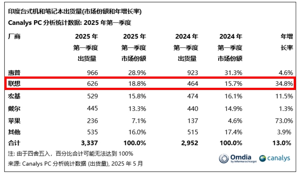 Canalys(现并入 Omdia)最新数据显示,2025 年第一季度印度 PC(不含平板电脑)出货量同比增长 13%,达 330 万台,而联想在这一增长浪潮中展现出非凡的竞争力。