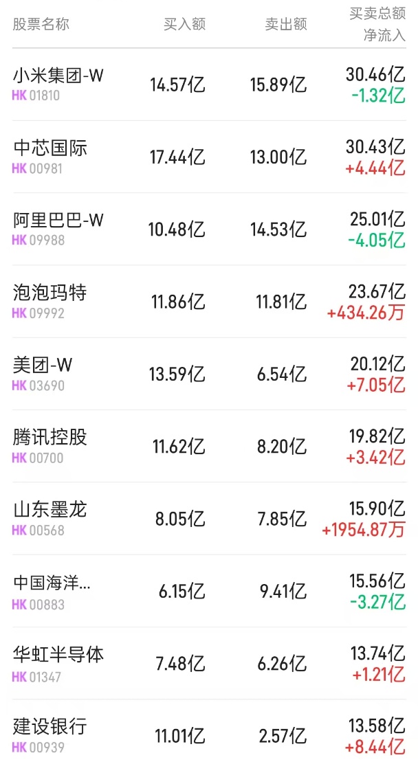 北水净买入最多的个股是美团-W(03690)、建设银行(00939)、中芯国际(00981)。北水净卖出最多的个股是阿里巴巴-W(09988)、中海油(00883)、小米集团-W(01810)。