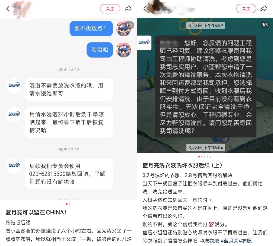 例如,针对衣物染色等常见问题,蓝月亮的客服团队会结合产品特性,提供长时间清水浸泡、寄洗等具体方案。这种“知识+产品”的服务模式,让消费者不仅买得放心,更用得明白。