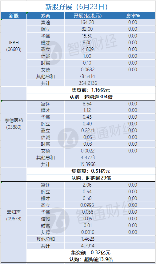 智通财经APP获悉,IFBH(06603)、泰德医药(03880)、云知声(09678)正在招股中。截止6月23日,富途、辉立、耀才等券商合计为IFBH借出354.2136亿港元,超购逾304倍;合计为泰德医药借出15.3966亿港元,超购逾29倍;合计为云知声借出4.7914亿港元,超购逾13.9倍。
