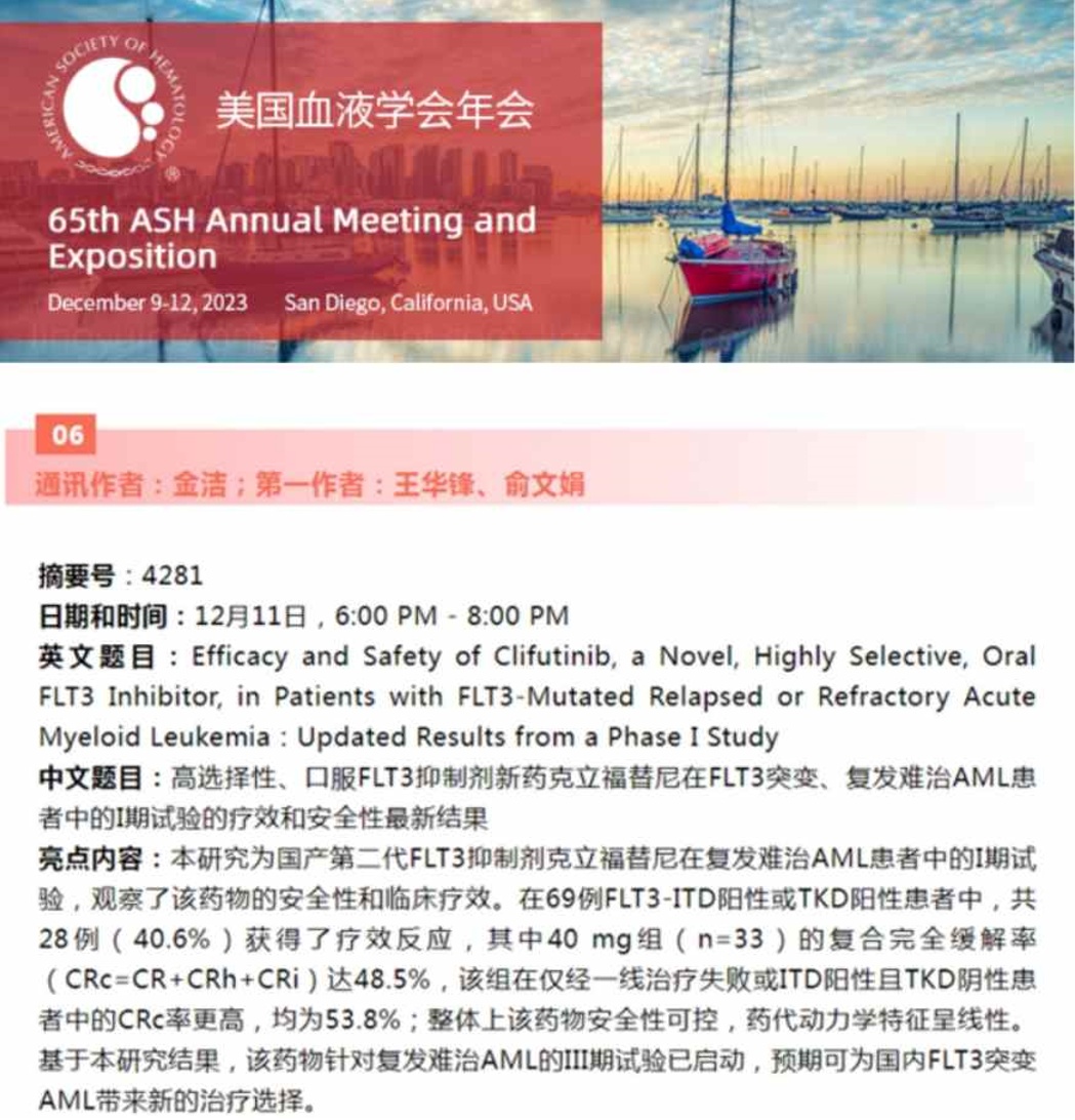 克立福替尼在临床前及临床I期研究中均表现出显著的抗肿瘤活性及良好的安全性,展现出广阔的临床应用前景。其创新的结构设计已于2025年发表于全球顶级药化期刊J. Med. Chem. 克立福替尼I期临床结果先后入选2022年第27届欧洲血液学协会年会(壁报交流)和2023年第65届美国血液学会年会(Poster展示),彰显国际学术界的认可。