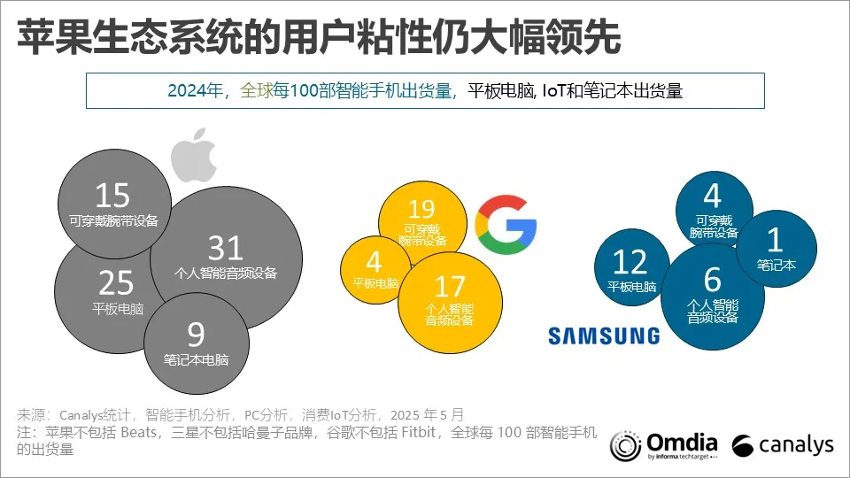 苹果的竞争优势在于其高度垂直整合的生态系统,以及其是唯一一家在智能手机、平板电脑和计算机三大终端形态中均占据显著市场份额的厂商——这三类设备合计占全球90%以上的互联网接入和近一半的用户日常屏幕接触。苹果在不同设备间的用户联动率居行业领先地位。Canalys(现并入Omdia)最新消费者调研,在发达市场,近一半的iPhone用户同时拥有iPad,三分之一还拥有Mac。这些跨设备的触点不仅带来持续性的营收流,更加深了生态粘性,形成了其他OEM厂商难以复制的护城河。