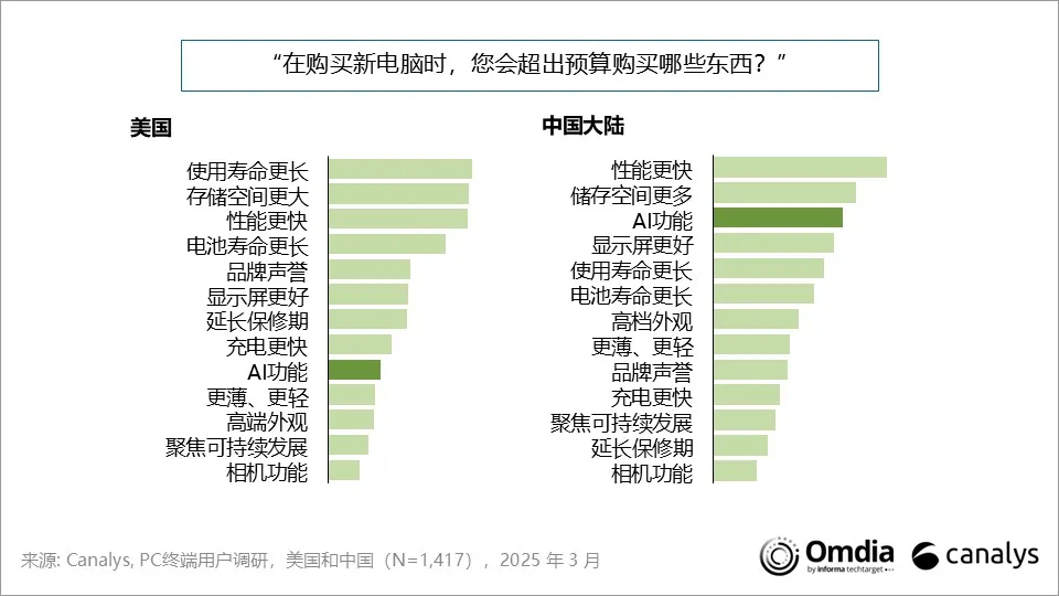 苹果在AI领域的主要竞争对手并非单一厂商,而是整个安卓和Windows生态系统。虽然这两个平台在AI兴趣和应用方面增长显著,但这些变化尚未真正转化为设备购买行为的驱动因素。最新调研结果揭示了一个明显差异:尽管消费者普遍表示AI功能将影响下一次设备选购,但在被问及具体情境时——如“你是否愿意为具备AI照片编辑或笔记摘要功能的笔记本支付更高价格?”或“你是否会因Circle to Search或Magic Eraser等AI功能而更换手机品牌?”——他们的购买意愿相比其他传统决策因素大幅下降。