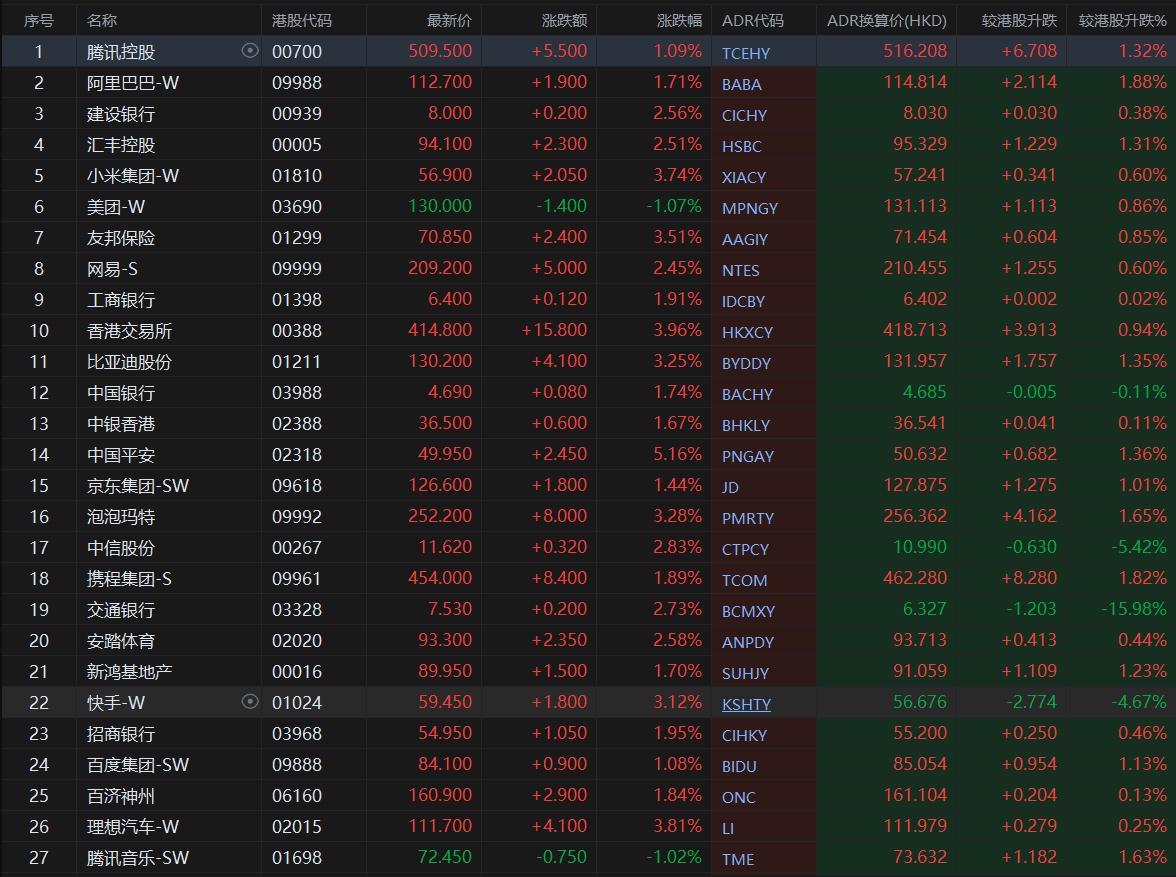 智通财经APP获悉,周二美股三大股指集体上涨,恒生指数ADR上涨,按比例计算,收报24303.62点,较香港收市涨126.55点或0.52%。