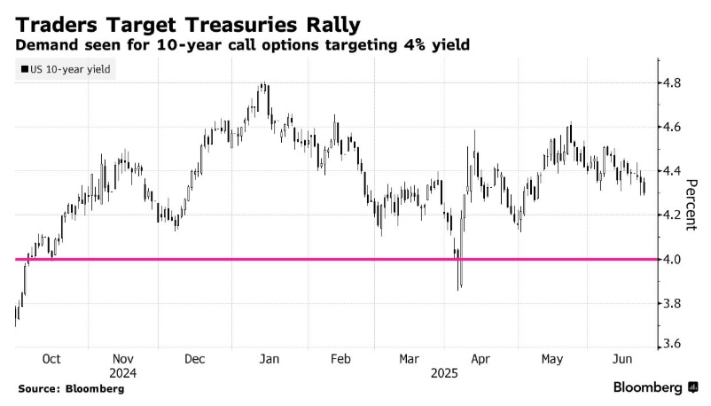 智通财经APP获悉,美国国债市场的交易员们正在大举通过期权押注10年期美债收益率下行,认为美联储主席鲍威尔在美国国会释放出“不排除7月降息”的重磅宽松信号催化降息预期大幅升温,加之近期美联储官员们普遍的鸽派表态以及中东局势仍然紧张的宏观经济背景下,有着“全球资产定价之锚”称号的10年期美国国债收益率将迈向跌至4%以下的显著下行轨迹——即押注该收益率曲线将跌至4月以来最低水平。