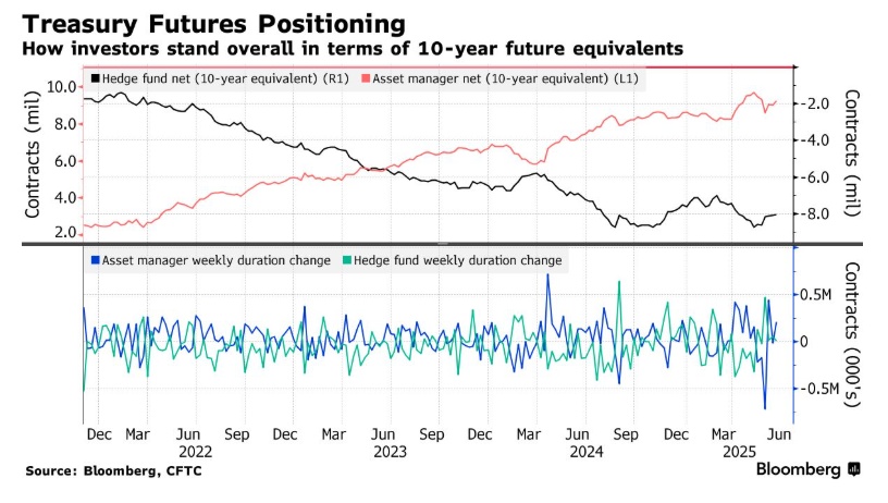 截至6月17日当周的 CFTC统计数据显示,传统资产管理机构继续在国债期货上增持净多头仓位:2 年期、10 年期及超10年期合计增加约 14.5万美元/DV01。对冲基金们则在10年期美债空头再增约4.9万美元/DV01,但在长债及超长债美国国债期货合计回补4.6 万美元/DV01空头。
