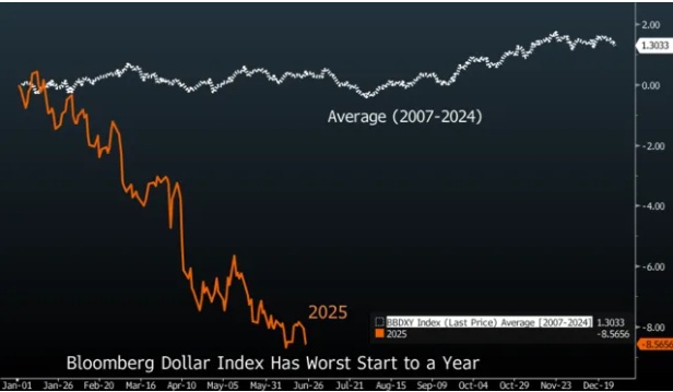 彭博美元指数今年已下跌逾8%,创下有记录以来最差年度开局。特朗普反复无常的政策搅动全球市场,动摇了投资者信心。过去十年间,外国投资者持有的美国证券(包括股票、政府债券和公司债券)规模已翻倍至31万亿美元。