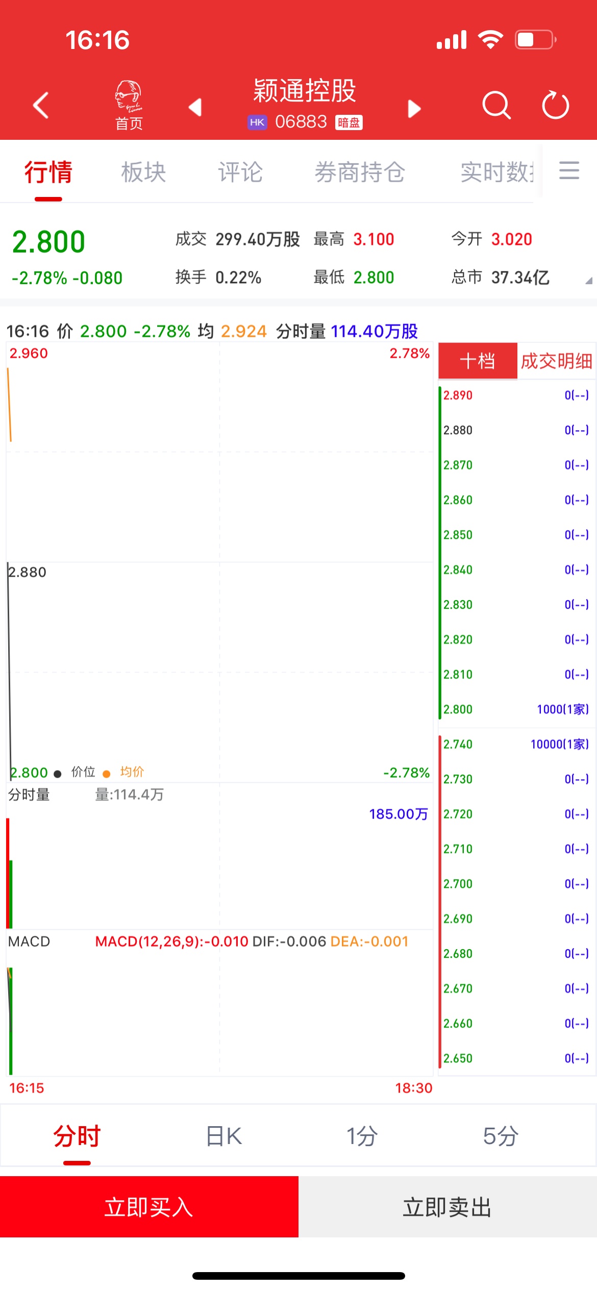 智通财经APP获悉,颖通控股(06883)将于6月26日(周四)在香港挂牌。截至发稿,利弗莫尔证券暗盘交易显示报价2.8港元,较招股价2.88港元下跌2.78%,每手1000股,不计手续费,每手亏80港元。