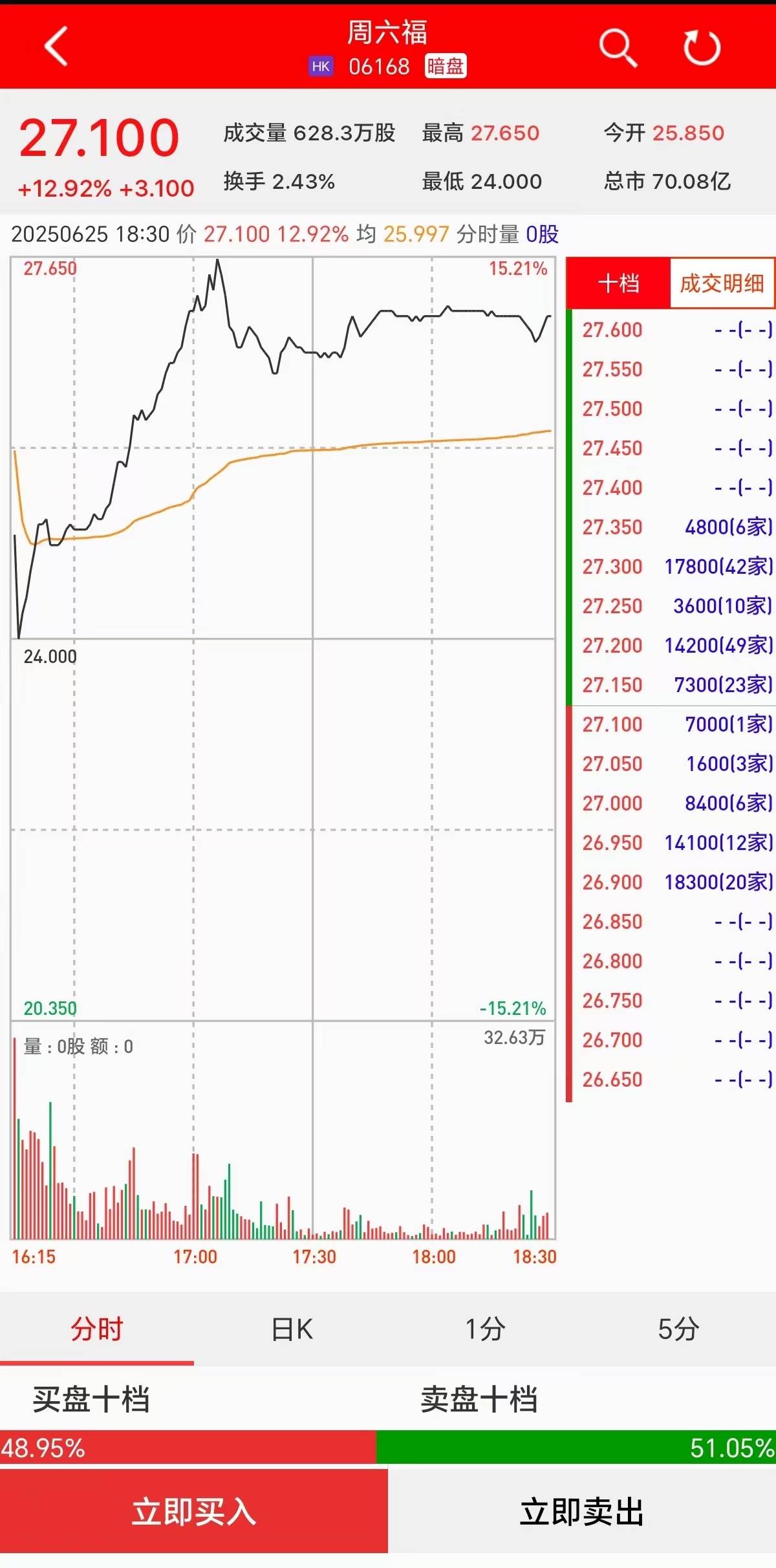 智通财经APP获悉,周六福(06168)将于6月26日(周四)在香港挂牌。截至收盘,利弗莫尔证券暗盘交易显示报价27.1港元,较招股价24港元上涨12.92%,每手100股,不计手续费,每手赚310港元。
