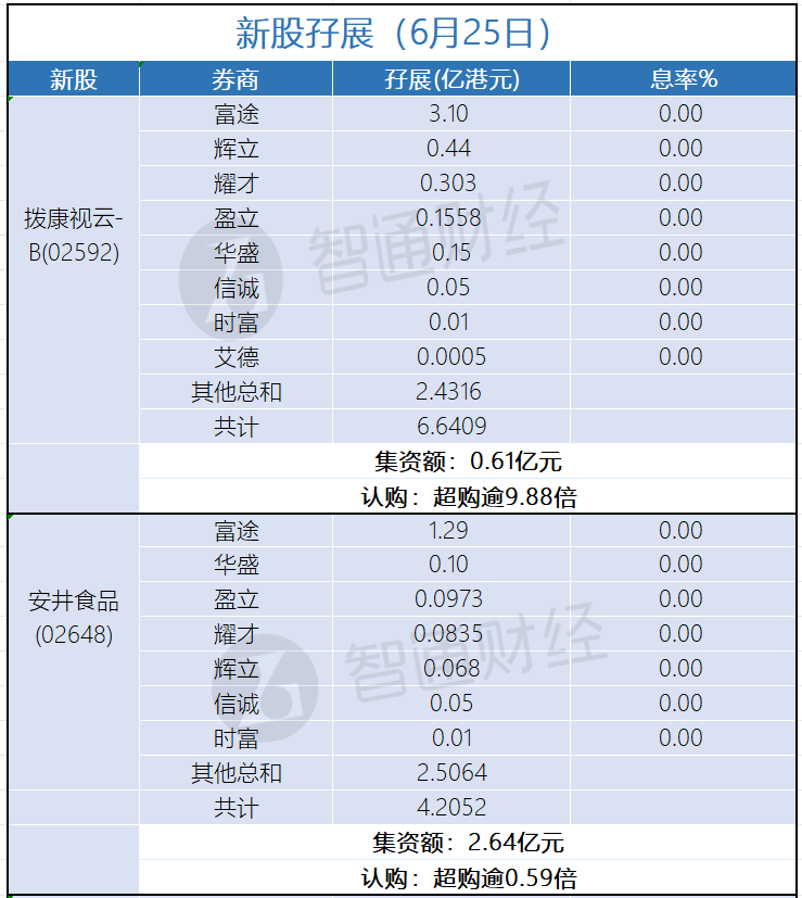 智通财经APP获悉,拨康视云-B(02592)、安井食品(02648)正在招股中。截止6月25日,富途、辉立、耀才等券商合计为拨康视云-B借出6.6409亿港元,超购逾9.88倍;合计为安井食品借出4.2052亿港元,超购逾0.59倍。