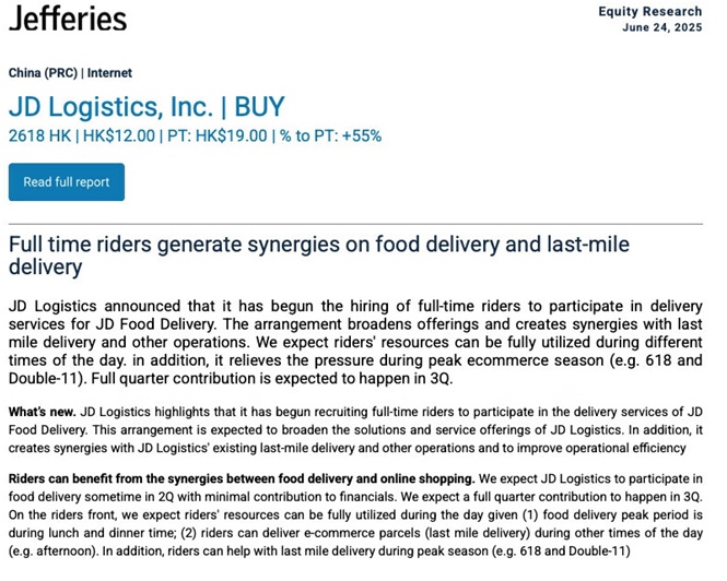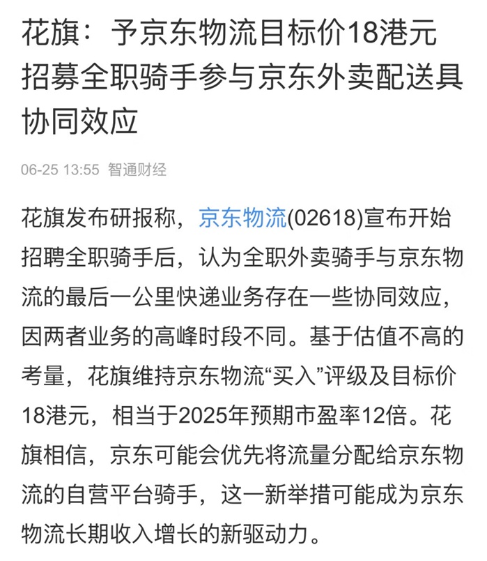 花旗发布研报称,全职外卖骑手和京东物流的最后一公里快递业务存在一些协同效应,因两者业务的高峰时段不同。基于估值不高的考量,花旗将维持京东物流“买入”评级及目标价18港元,相当于2025年预期市盈率12倍。