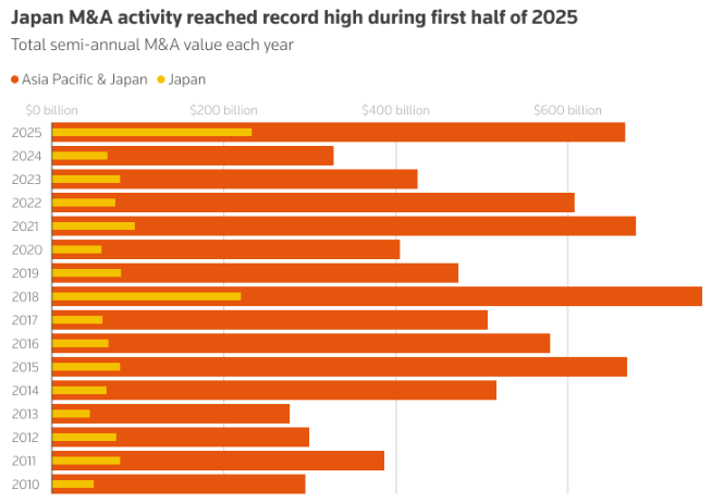 智通财经APP获悉,2025 年,日本正引领亚洲并购市场的复苏,上半年的并购交易额高达 2320 亿美元。银行家们预计,这一趋势将因数十亿美元的私有化交易、对外投资以及私募股权活动而持续下去。据 LSEG 的数据,涉及日本企业的交易价值在上半年增长了超过三倍,而同期亚洲的并购交易价值达到了 6500 亿美元,较去年同期增长了两倍多。