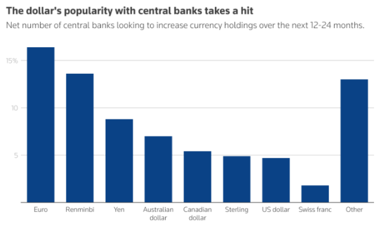 与此同时,周二公布调查显示,全球各大央行所管理的数万亿美元储备资产的管理者们正考虑将资金从美元转向黄金、欧元以及人民币。据国际货币与金融机构论坛(OMFIF)周二的报告称,管理着总计 5 万亿美元资产的三分之一的央行计划在未来一到两年内增加对黄金的投资,剔除那些计划减少投资的央行后,这一比例达到了至少五年来的最高水平。