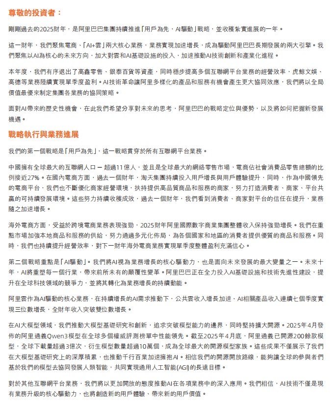 股东信分享了过去一个财年阿里的战略执行与业务进展。过去一个财年,阿里巴巴聚焦电商、“AI+云”两大核心业务,业务实现加速增长。阿里还加大对云和AI基础设施的投入,加速推动AI技术创新和落地千行百业。同时,阿里有序退出高鑫零售、银泰百货等资产,并稳步提高多个互联网平台业务的经营效率,虎鲸文娱、高德等业务陆续实现单季度盈利。