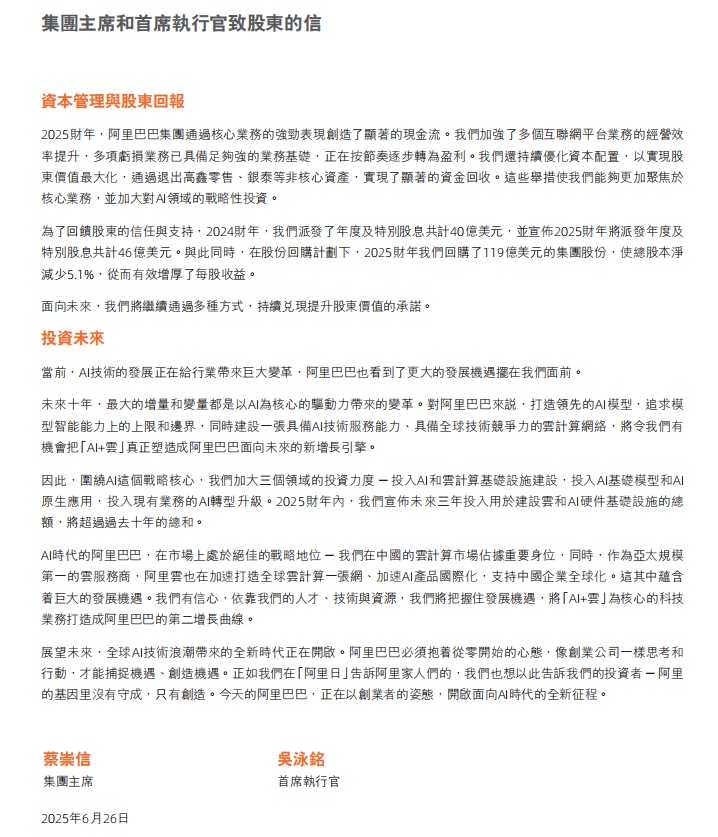 智通财经APP获悉,6月26日,阿里巴巴集团(09988)发布2025财年年报。在年报致股东信中,蔡崇信、吴泳铭表示,展望未来,全球AI技术浪潮带来的全新时代正在开启。阿里巴巴必须抱着从零开始的心态,像创业公司一样思考和行动,才能捕捉机遇、创造机遇。“正如我们在‘阿里日’告诉阿里家人们的,我们也想以此告诉我们的投资者——阿里的基因里没有守成,只有创造。今天的阿里巴巴,正在以创业者的姿态,开启面向AI时代的全新征程。”