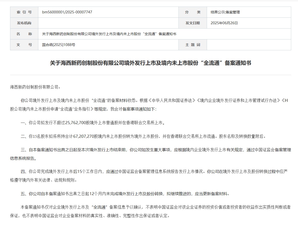 智通财经APP获悉,6月26日,中国证监会国际合作司发布《关于海西新药创制股份有限公司境外发行上市及境内未上市股份“全流通”备案通知书》。公司拟发行不超过25,762,700股境外上市普通股并在香港联合交易所上市。此外,该公司15名股东拟将所持合计67,207,270股境内未上市股份转为境外上市股份,并在香港联合交易所上市流通。