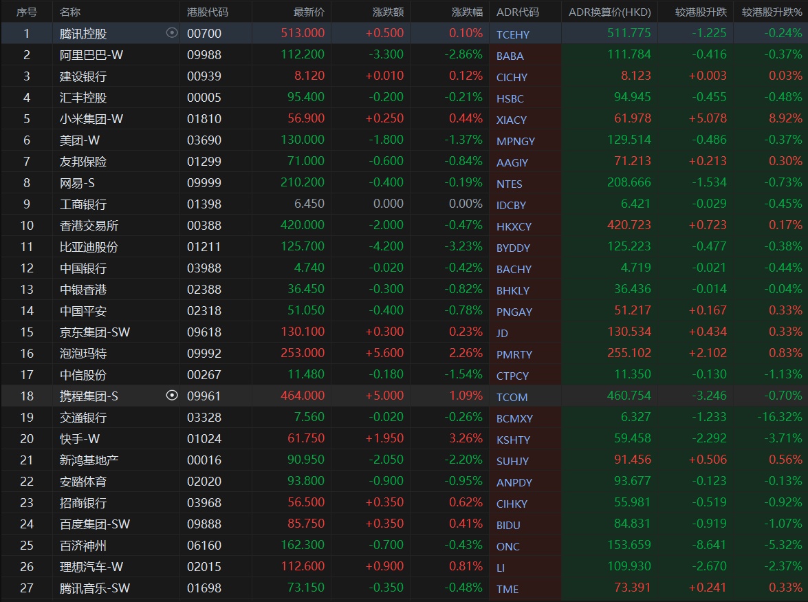 大型蓝筹股涨跌不一,汇丰控股收报94.945港元,较香港收市跌0.48%;腾讯控股收报511.775港元,较香港收市跌0.24%。