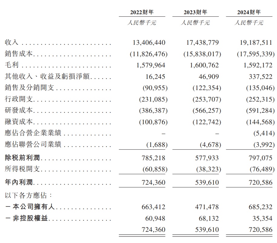 财务方面,2022财年、2023财年、2024财年,国恩科技实现总收入分别约为134.06亿元、174.39亿元、191.88亿元人民币;同期年内利润分别约为7.24亿元、5.4亿元、7.21亿元人民币。