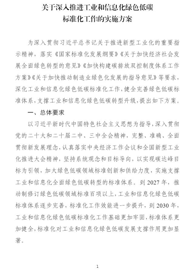 为切实发挥标准对工业和信息化绿色低碳领域的引领和支撑作用,健全完善绿色低碳标准体系,我部组织编制了《关于深入推进工业和信息化绿色低碳标准化工作的实施方案》,现印发给你们。请结合本地区、本行业、本领域实际,在标准化工作中贯彻执行。