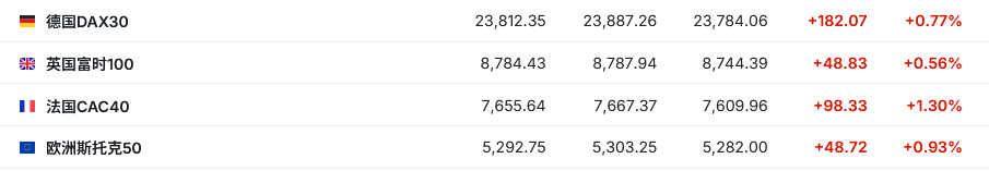 2. 截至发稿,德国DAX指数涨0.77%,英国富时100指数涨0.56%,法国CAC40指数涨1.30%,欧洲斯托克50指数涨0.93%。