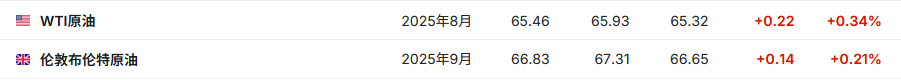 3. 截至发稿,WTI原油涨0.34%,报65.46美元/桶。布伦特原油涨0.21%,报66.83美元/桶。