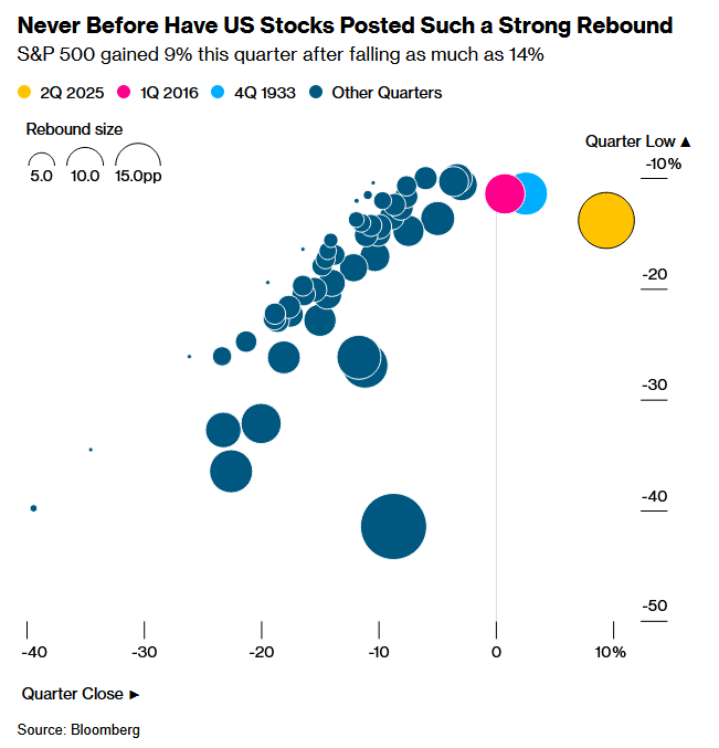 智通财经APP获悉,从三个月前险些跌入熊市,到如今距离历史高位仅差一步之遥,美股这轮反弹堪称历史性。在过去的100年里,标普500指数在同一季度内下跌10%后又成功反弹的情况只有三次,本轮反弹便是其中之一。不同的是,2016年和1933年的两次快速反弹最终仅实现小幅上涨,但本季度的标普500指数预计将上涨近10%。