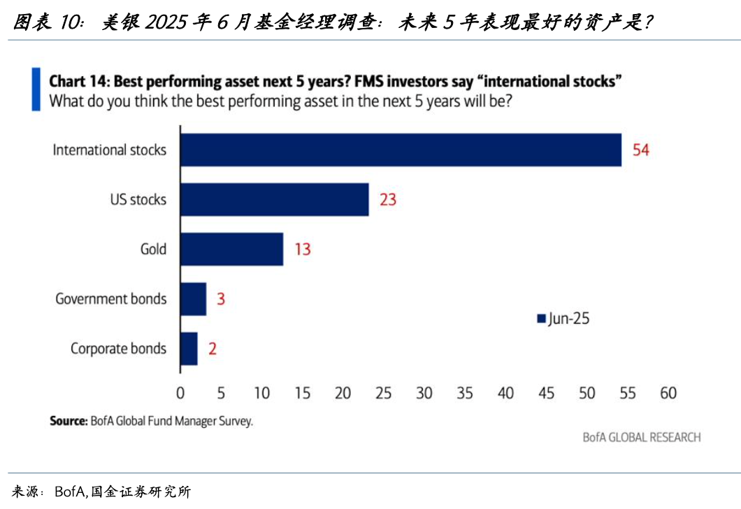 根据美银6月全球基金经理调查,57%的受访者认为未来5年表现最好的资产是非美股票,认为未来5年表现最好的资产是美股的受访者仅为24%。仓位上,目前机构投资者最倾向于超配欧股和新兴权益,最倾向于低配美股、美元和能源类商品。受制于美元走弱,外国机构投资美股以本币计价损失增加。不同于外资恐慌式的撤退,内资当前对美股更倾向于谨慎态度。