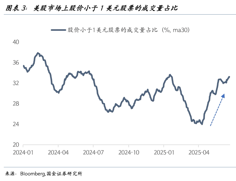 当前的美股是散户乐观、机构悲观。6月12日当周,美股散户看多比例达到33.2%,为1月底以来新高;看空比例为33.6%,为1月底以来新低。散户乐观的另一个佐证,是小市值股票成交火热,因为小市值股票往往是散户们激烈博弈的战场。截至6月18日,美股市场上股价小于1美元的公司成交量占比升至36.6%,较4月9日上升近20个百分点。