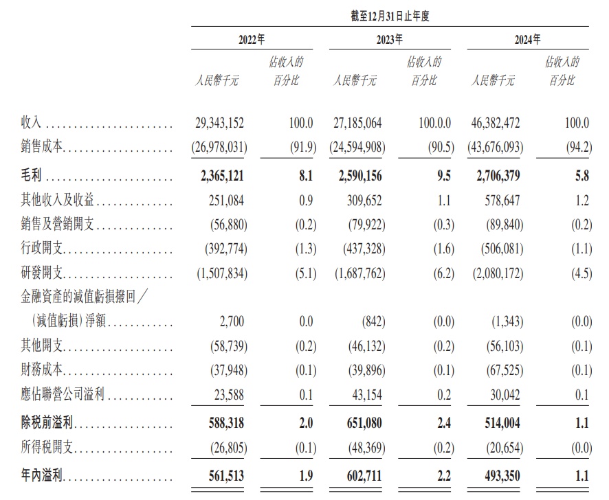 该公司年内溢利由2022年的约5.62亿元人民币增加7.3%至2023年的约6.03亿元人民币。2024年该公司溢利同比减少18.1%至4.93亿元人民币。