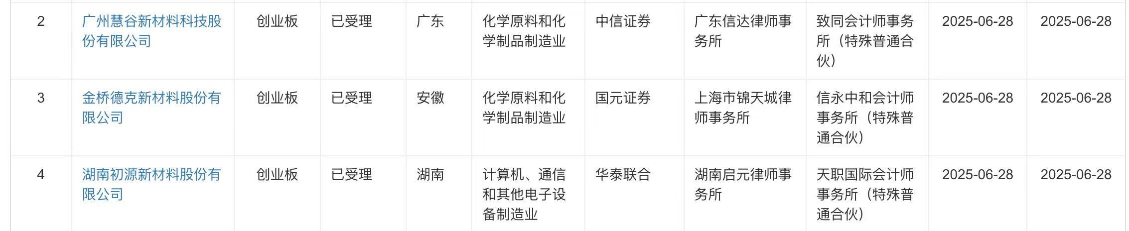 智通财经APP获悉,6月28日,深交所披露,广州慧谷新材料科技股份有限公司(慧谷新材)、金桥德克新材料股份有限公司(金桥德克)、湖南初源新材料股份有限公司(初源新材)深交所创业板IPO申请已获受理。